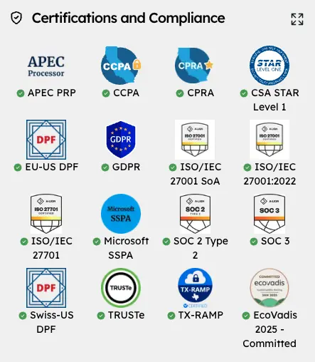 - Compliance Claims: there is often a panel with badges for various types of compliance that the company claims to abide by. For example, this may include: SOC 1, SOC 2, SOC 3, ISO-27001, CCPA, GDPR, HIPAA, PCI DSS, TX-RAMP, TRUSTe, EU-US DPF, TISAX, CASA, and more. You can expect that most companies are proud, and strategically interested in revealing, which of these types of compliance claims they are making -- since many enterprise buyers (and other buyers as well) have specific compliance claims that they expect or require. (example)
