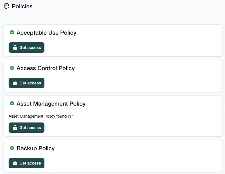 - Policies: often a Trust Center will reveal a list of policies that the company has adopted, although it's unlikely that the specific policy is available for public download. For example, in a software comparison, you should likely expect to see that each sophisticated entrant has policies such as Acceptable Use Policy, Data Retention Policy, Incident Response Plan / Policy, Business Continuity Plan, etc. (example)